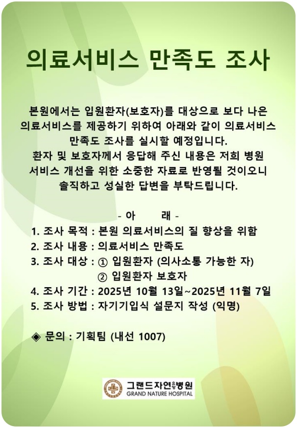 의료서비스 만족도 조사(2025년10월13일~11월7일) 페이지 정보 작성자 최고관리자 작성일25-10-10 12:24 조회728회 댓글0건 이전글 다음글 목록 본문 의료서비스 만족도 조사 댓글목록 등록된 댓글이 없습니다. 이전글 다음글 목록
