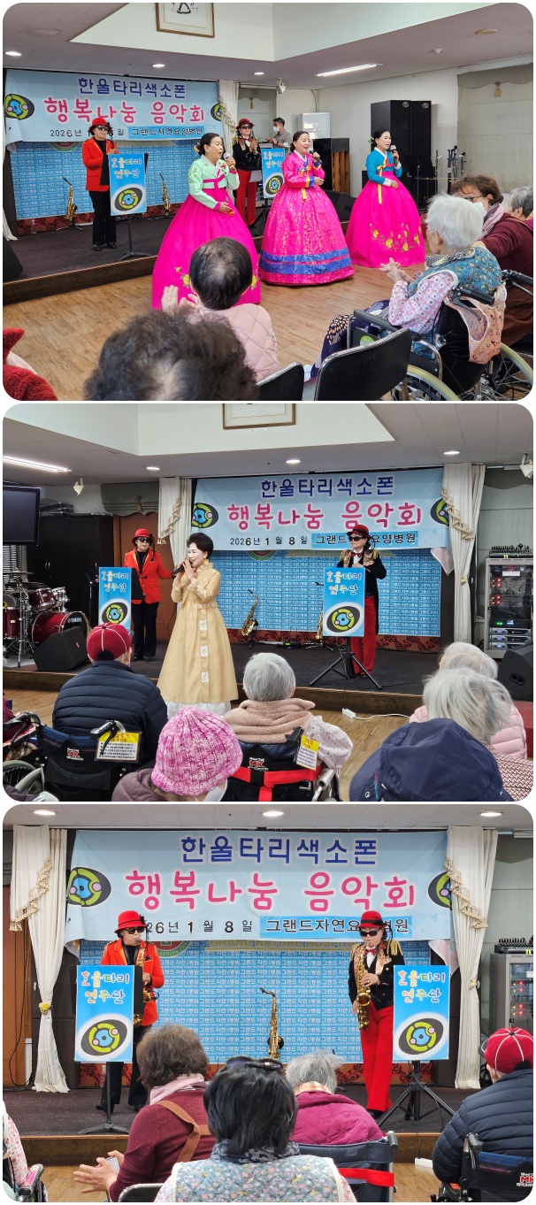 그랜드자연요양병원은 1월 8일 한울타리 색소폰의 <행복 나눔>공연으로 작은 음악회를 열었다. 이날 공연은 <울어라 열풍아>, <강원도 아리랑> 등의 색소폰 연주와 <태평가>, <경복궁 타령> 등의 옛가요, 민요로 어르신들과 함께 즐거운 시간을 마련했다.