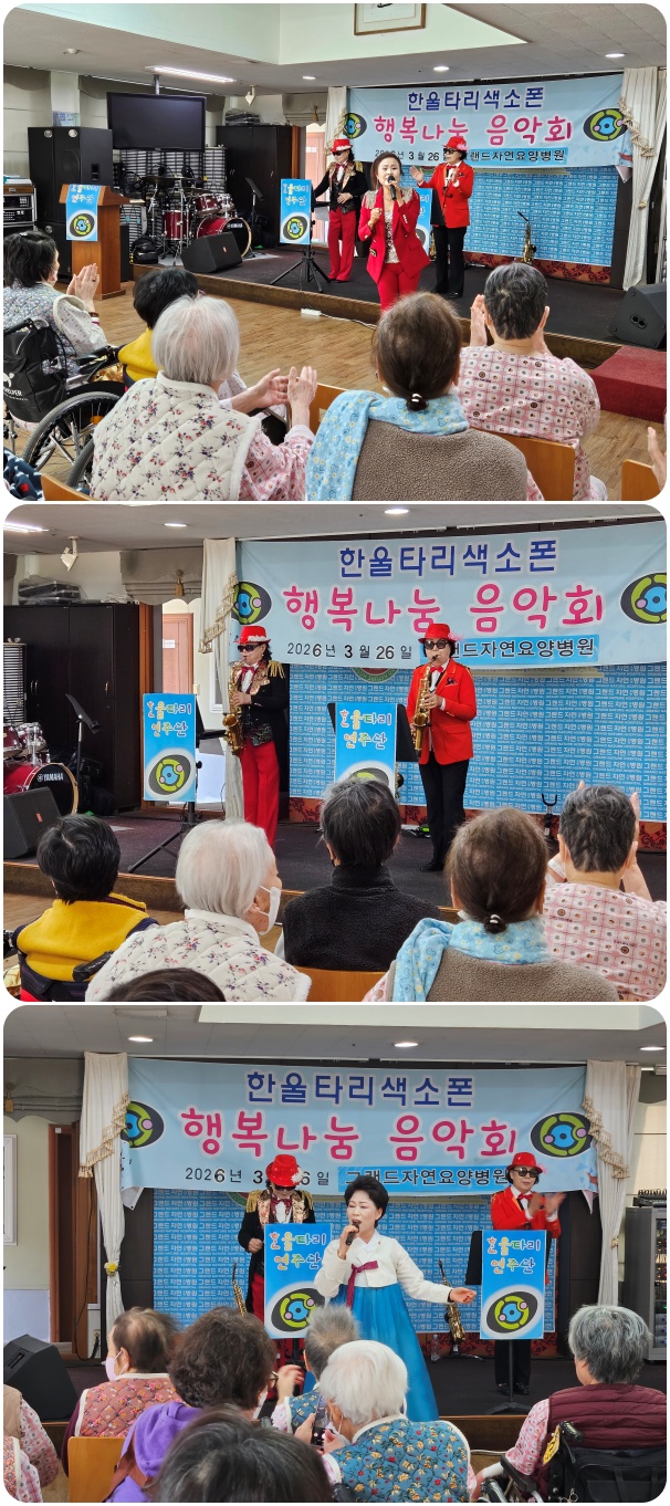 3월 26일 한울타리 연주단의 공연으로 그랜드자연요양병원 5층 이벤트홀에서 작은음악회가 열렸다. 한울타리 연주단은 <부산 아가씨>, <섬마을 선생님>등 어르신들이 평소 즐겨 부르시는 옛가요와 민요를 비롯하여 색소폰 연주로 어르신들과 함께 흥겨운 시간을 마련했다.