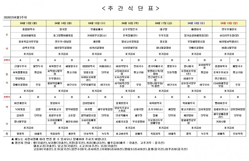 주간 식단표 (4월 3주) 페이지 정보 작성자 최고관리자 작성일26-04-09 10:46 조회192회 댓글0건 이전글 다음글 목록 본문 주간 식단표 (4월 3주) 댓글목록 등록된 댓글이 없습니다. 이전글 다음글 목록
